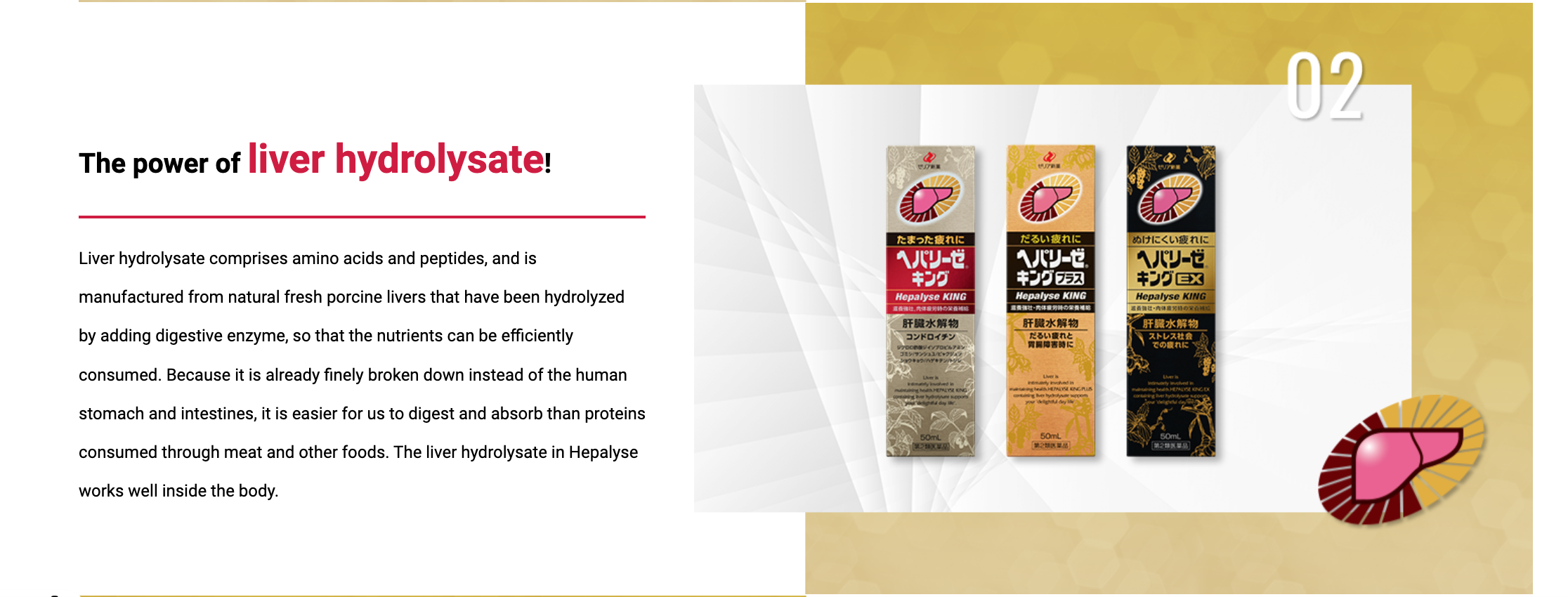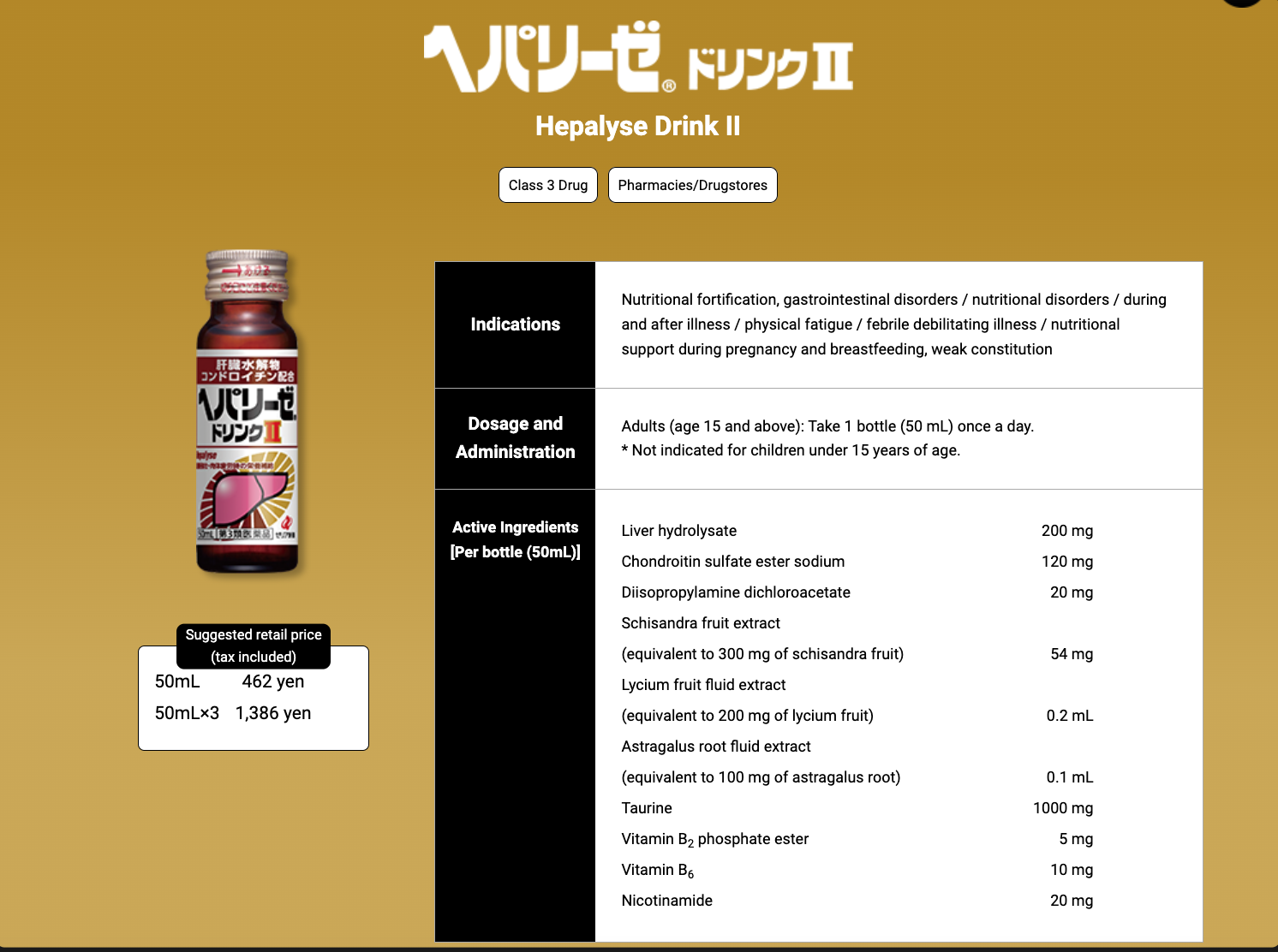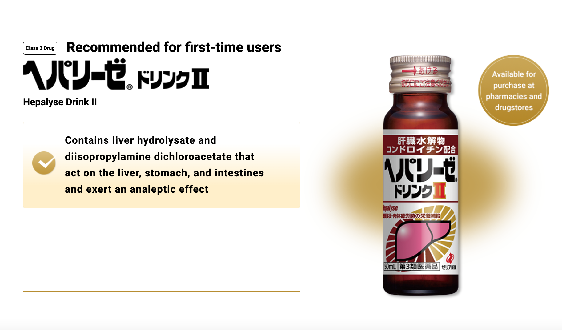 The Number 1 Selling Anti Hangover Product in Japan. Contains liver hydrolysate and diisopropylamine dichloroacetate that act on the liver, stomach, and intestines and exert an analeptic effect